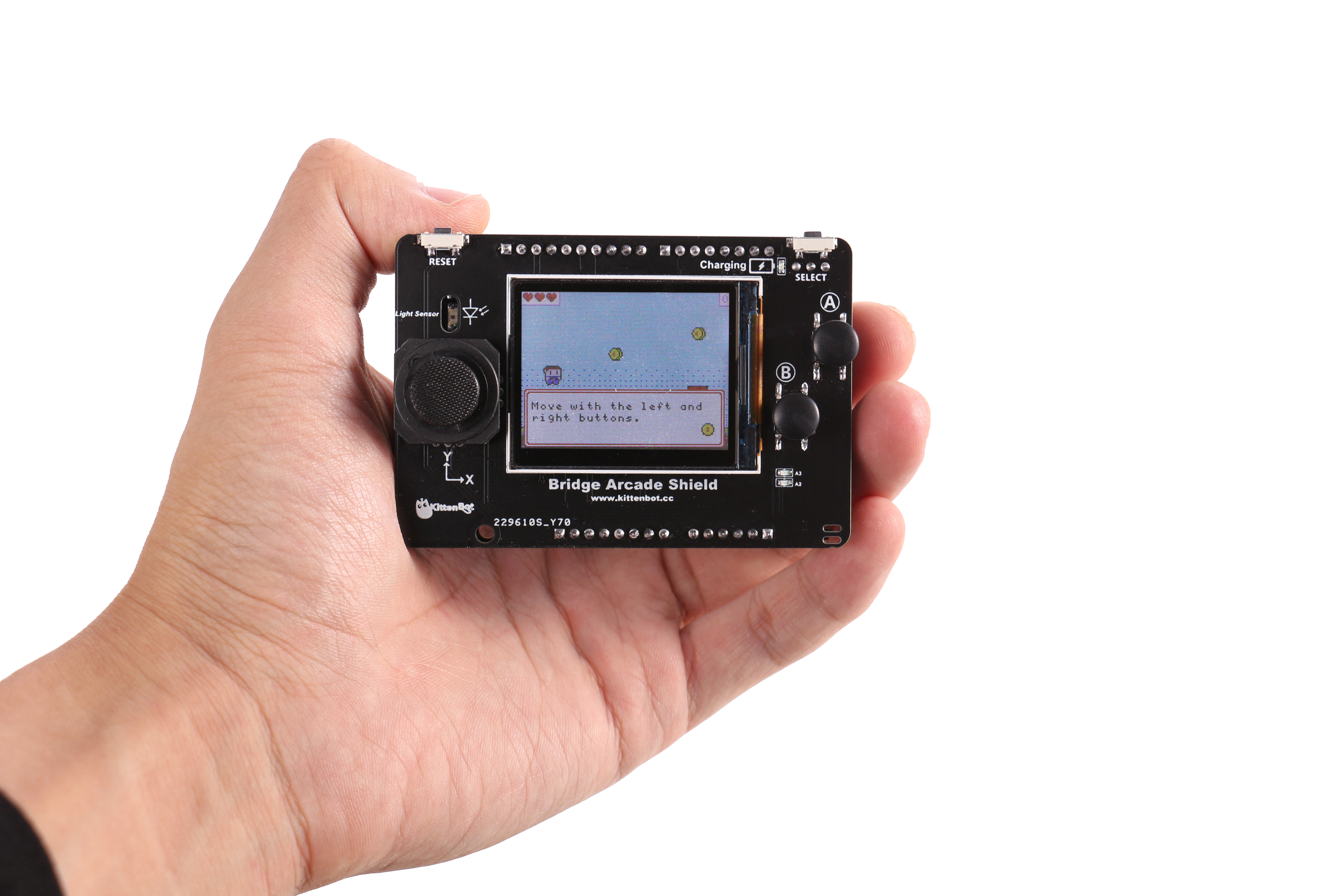 Arcade shield is an extension board of Bridge, which is loaded with Arcade shield. The Bridge with Arcade shield is transformed into a programmable handheld game console. Insert the shield into the Bridge according to the corresponding position