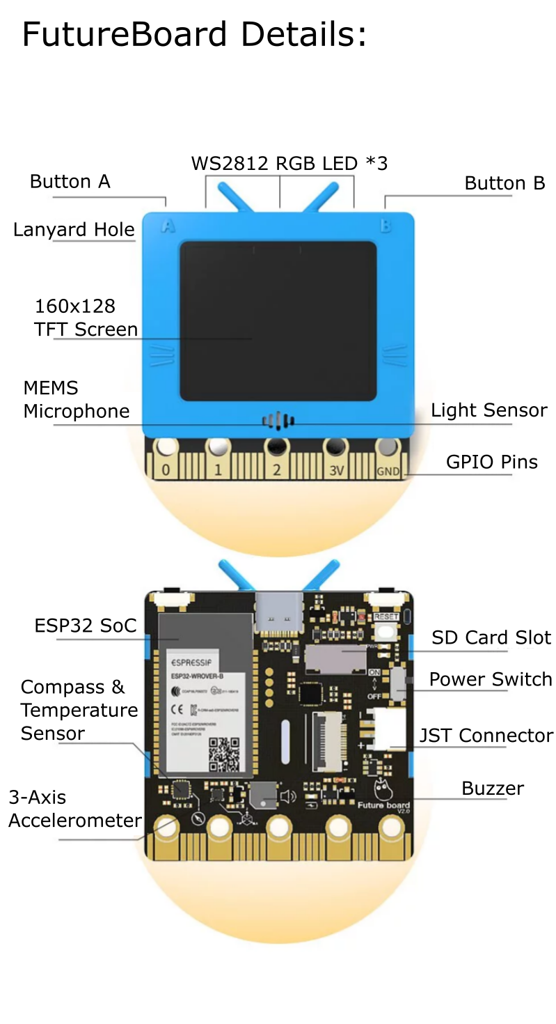 As STEM education shifts its focus towards AI and IoT, FutureBoard is equipped to satisfy these requirements. Based on the ESP32 chipset, FutureBoard is able to connect to the Wifi for IoT projects, catering to the trend for the current STEM Education development. FutureBoard retains the design for the edge connectors from the BBC Micro:bit, allowing for easy expandability and compatibility with existing sensors and modules, bridging the past and the future.