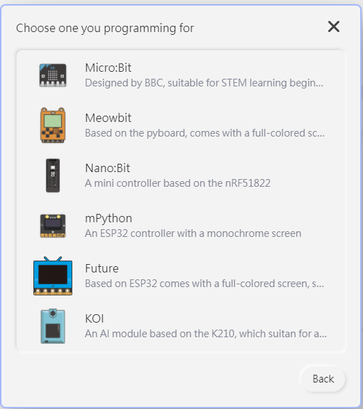 FutureBoard runs on MicroPython, KittenBot recommends KittenCode or KittenBlock for programming your FutureBoard with Micropython.